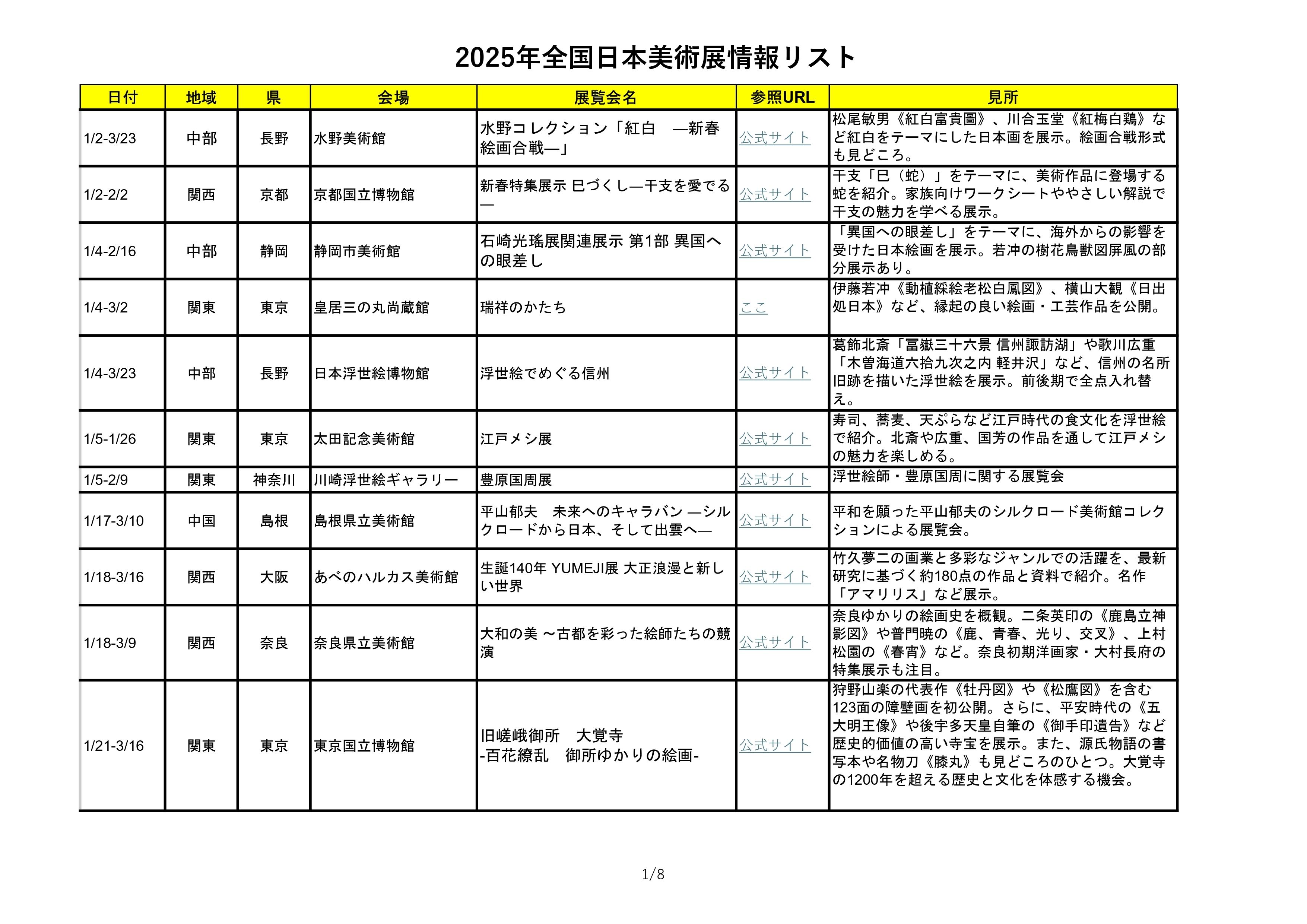 2025年の全国日本美術展情報を網羅したリストのエクセルデータです。(このデータは2024年12月1日までの発表情報を基にしています。)